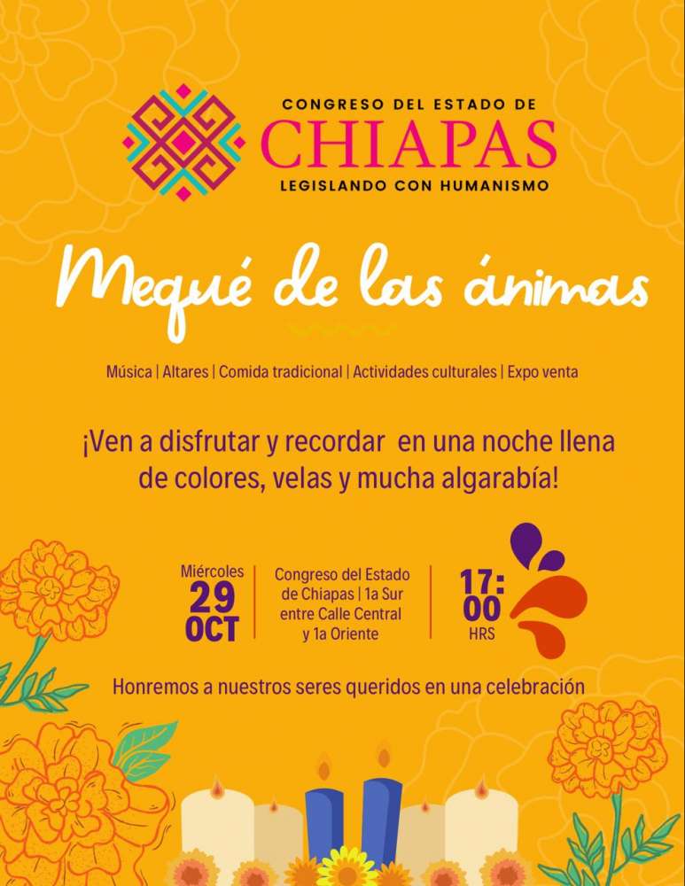 Tuxtla Gutiérrez, Chiapas; 26 de octubre de 2025.- Las y los diputados del Congreso del Estado invitan al público en general a que acudan este 29 de octubre a partir de las 17:00 al evento denominado: “Mequé de las Ánimas”,