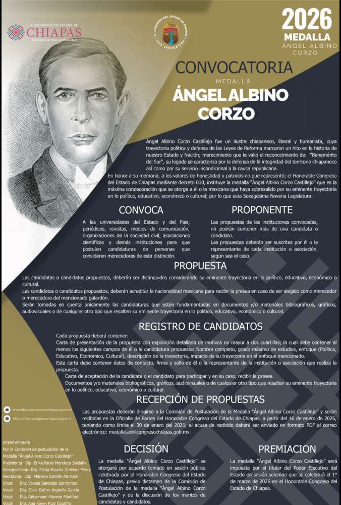 Las propuestas deberán dirigirse a la Comisión de Postulación de la Medalla "Ángel Albino Corzo Castillejo" y serán recibidas en la Oficialía de Partes del Honorable Congreso del Estado de Chiapas, a partir del 16 de enero de 2026, teniendo como límite el 30 de enero del 2026; el acuse de recibido deberá ser enviado en formato PDF al correo electrónico: Esta dirección de correo electrónico está siendo protegida contra los robots de spam. Necesita tener JavaScript habilitado para poder verlo..